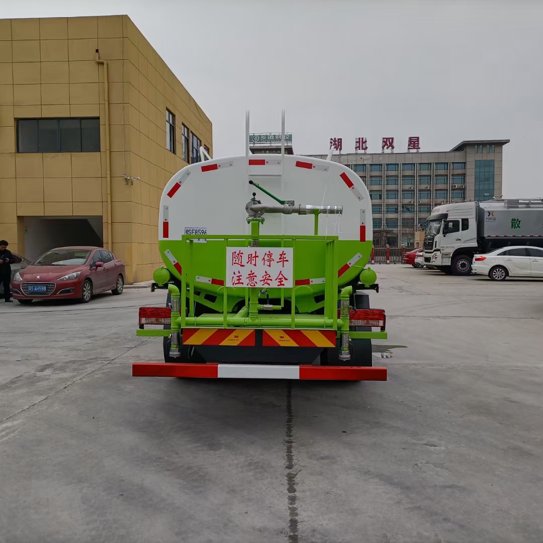 4.灑水車前噴頭位置較低,靠近地面,噴灑壓力較大,可用于沖洗路面;后噴頭位置較高(灑水車后噴頭一般左右各安裝一個),灑水面較寬,可用于公路施工灑水,使用后噴頭時,應(yīng)將前噴管關(guān)閉;使用可調(diào)噴頭灑水時,灑水寬度可根據(jù)需要調(diào)整。灑水寬度越寬,中間重疊量越少,灑水密度越均勻。