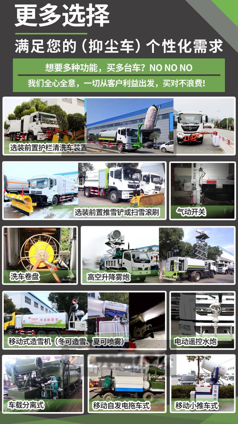 底盤參數(shù):采用國六東風(fēng)D9底盤,公告型號:CLW5180TDYD6型多功能抑塵車,顏色按公告色,4500軸距,玉柴200馬力,1000R20輪胎,帶備胎,帶空調(diào),ABS,法士特六檔箱。