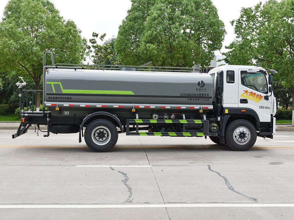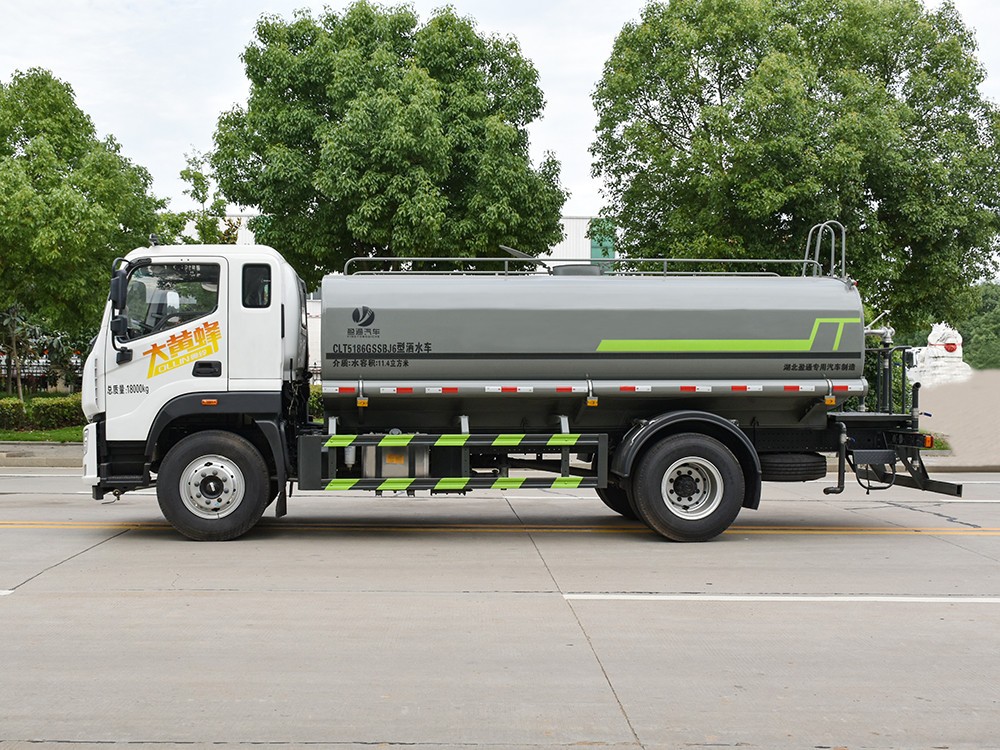 福田大黃蜂 14.2 方灑水車產品主要技術參數 序號 名稱 型號、規格 1 整車型號 CLT5186GSSBJ6 型灑水車 2 發動機型號 YCS04200-68 3 發動機馬力/功率 玉柴 200 馬力/147KW 4 發動機排量 4156ML 5 變速箱 法士特 8 檔(帶高低速) 6 輪胎規格 10.00 鋼絲胎 7 軸距 4500 8 總質量 18000KG 9 整備質量 6940KG 10 額定載質量 10865KG 11 整車尺寸(長×寬×高) 8.45*2.5*3.2 12 罐體容積 14.2 方 13 燃料種類 柴油 14 排放標準 國六 15 水泵型號 60/90 16 罐體材質 Q235 碳鋼
