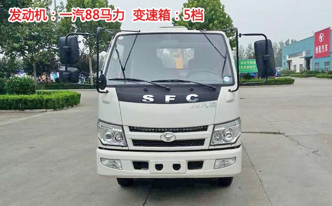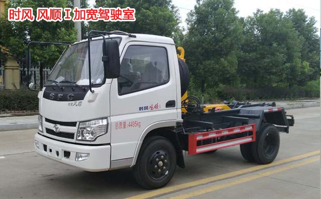 時風(fēng)風(fēng)順勾臂式垃圾車,風(fēng)順Ⅰ加寬駕駛室,一汽88馬力發(fā)動機,5檔變速箱,軸距2.7米,6.50-16輪胎,帶方向助力、ABS,油剎。