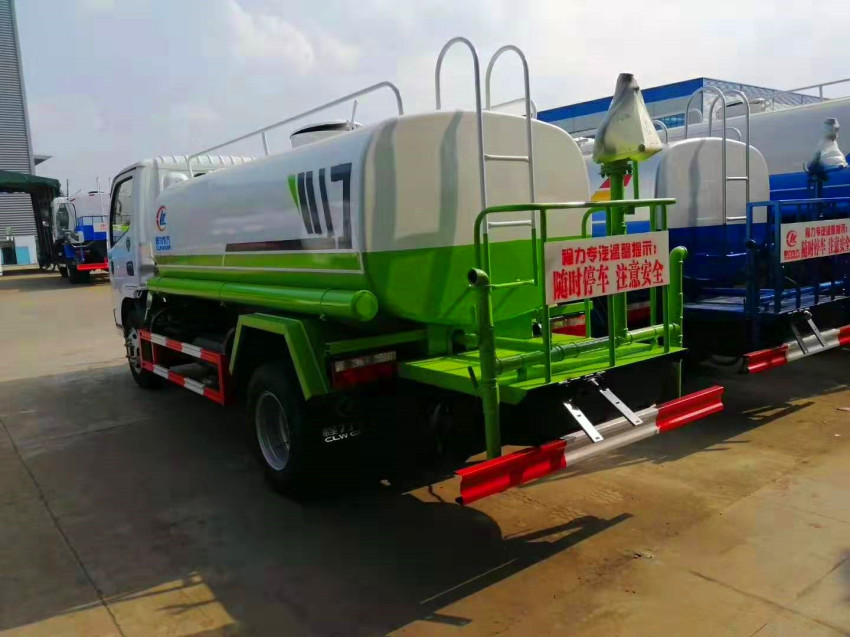 灑水車上裝配置:罐體用4MM碳鋼板制作(10T以上為5MM),罐內隔板具有防波作用,以減低汽車行駛時罐體液體的沖擊。整車帶一個專用灑水泵(垂直最大吸程6米),灑水寬度14~16米,射程28米。引水時間<5min,流量90m3/h。多功能灑水車配備2個前沖(噴)---能將路面泥巴、塵土、垃圾沖干凈;2個后灑---能均勻地將水灑在路面,一次灑水寬度14米、2個側噴(花灑)---能均勻地將路旁綠化帶澆灌、帶1個后工作平臺,平臺上安裝1個綠化灑水高炮---灑水炮可全方位旋轉,可連續調成直沖狀、大雨、小雨、毛毛雨,霧狀可調節沖洗高大樹木。10T以上中型灑水車配1組高位花灑---一般配置3~5個花灑蓮蓬頭,用于路右側花壇澆水。帶1個消防接頭,帶1個自流閥,1個過濾裝置、人性化爬梯及側防護欄,安裝灑水音樂喇叭。